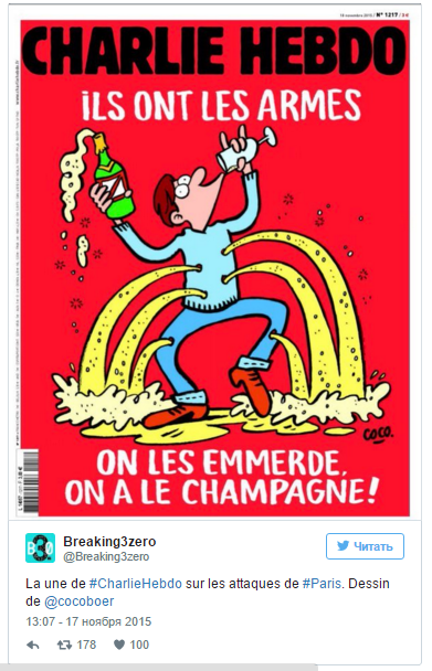 На рисунке изображен танцующий человек с бокалом шампанского. На его теле – несколько сквозных ранений от пуль, из которых выливаются потоки вина. Подпись под карикатурой гласит: «У них есть оружие. Да пошли они, у нас есть шампанское!».