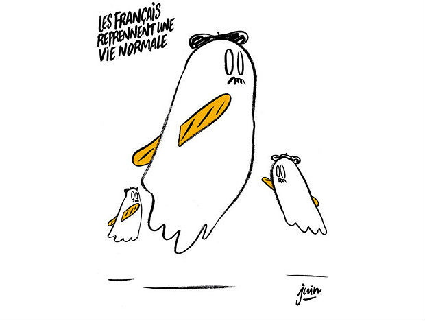 Днем ранее главный редактор Charlie Hebdo Жерар Бияр презентовал другую карикатуру, посвященную парижским террористическим атакам. Она была размещена на сайте издания по соседству с выражением соболезнования семьям погибших. На рисунке запечатлены парящие в воздухе привидения в белых простынях, которые, если судить по беретам, усам и багетам под мышкой, изображают покойных французов. Картинка подписана фразой: «Французы возвращаются к нормальной жизни».