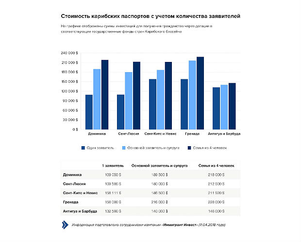 Такой вариант хотя и является достаточно затратным, выглядит привлекательнее традиционного способа — инвестиций в Фонд диверсификации сахарной промышленности, размер которых составляет $250 тысяч. Этот способ предусматривает также доплату в размере 50 тысяч долларов США за участие в программе супруга или супруги, и еще по 25 тысяч — за каждого следующего члена семьи.