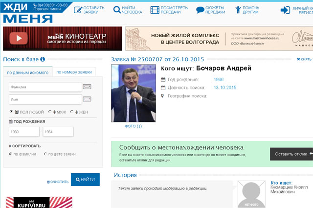 Волгоградский предприниматель и блогер Кирилл Кусмарцев разместил на сайте популярной телепрограммы «Жди меня» заявку на поиск губернатора области Андрея Бочарова.