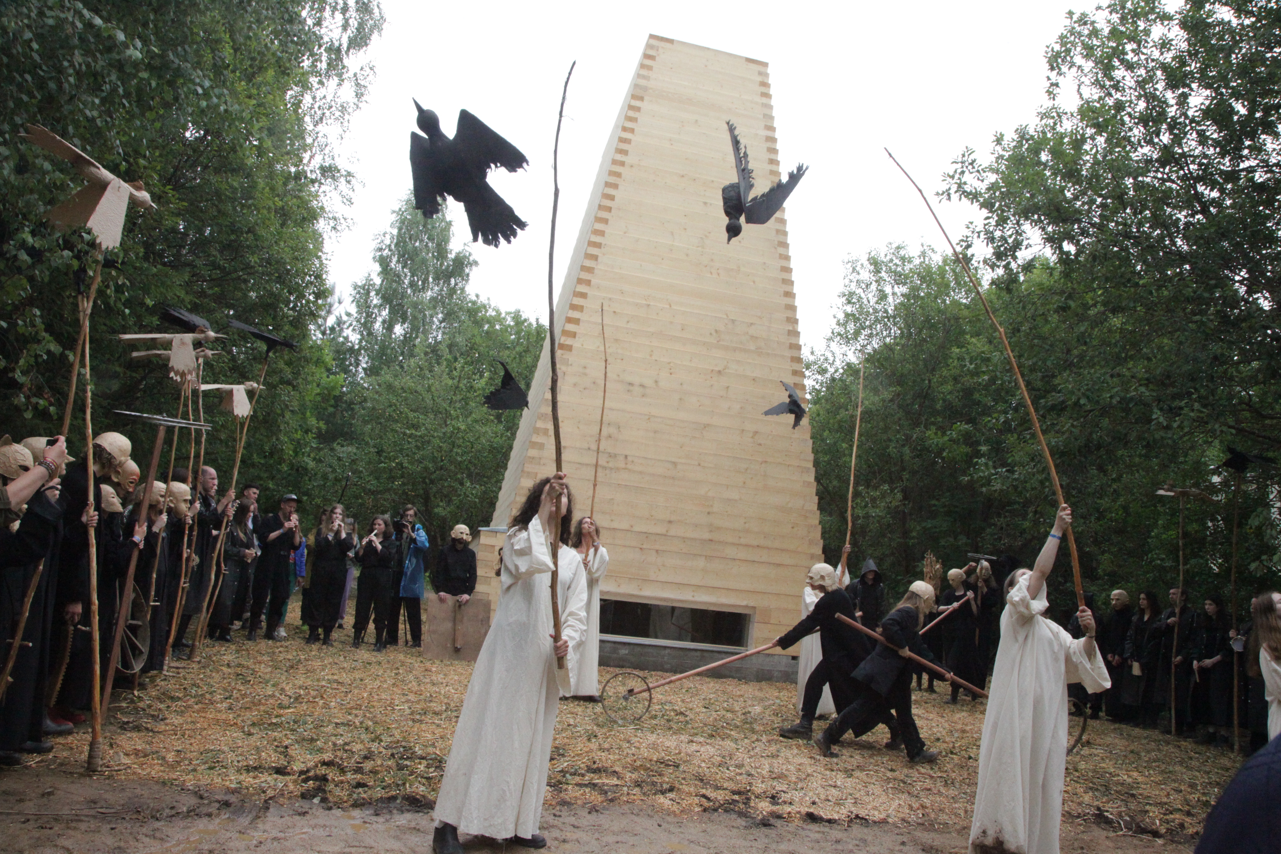 Не могу себе представить мой рассказ без сюжета, ставшего контрапунктом ко всем остальным придумкам «Архстояния». Это цепочка спектаклей театров «Пух и прах», «Трикстер», Хорового театра Бориса Певзнера и других коллективов на музыку современных российских композиторов в постановке режиссера и художницы Этель Иошпы (до сих пор я знал ее как оформителя спектаклей театра «Новая опера»), показанных в разных частях арт-парка. Началось с вокально-инструментального действа «Сколько мне жить осталось, кукушка?» у подножия дома-обелиска, продолжилось танцевальной композицией хореографа Ольги Цветковой для ансамбля перформеров с зеркалами «Что день грядущий мне готовит» в чистом поле. Затем – игровая притча на тему борьбы за право дышать чистым воздухом у оцинкованных коробов «Воздухопровода», чуть позже – спародированное народное гадание «на жениха» у «Павильона заблуждений»… И в завершение – 40-минутное представление «Сон Татьяны», навеянное, как нетрудно догадаться, знаменитым эпизодом пушкинского «Евгения Онегина». Премьера работы, знаю, состоялась не здесь, а в музее-заповеднике «Михайловское» год назад. Но мистика николо-ленивецкого леса, где перекликались русалочьими голосами и ворожили зеркалами (вновь этот символ гадания и одновременно призыв всмотреться в самого себя!) десятки «Татьян» сомнамбулического вида, как нельзя лучше соответствовала духу этой мрачной фантазии.