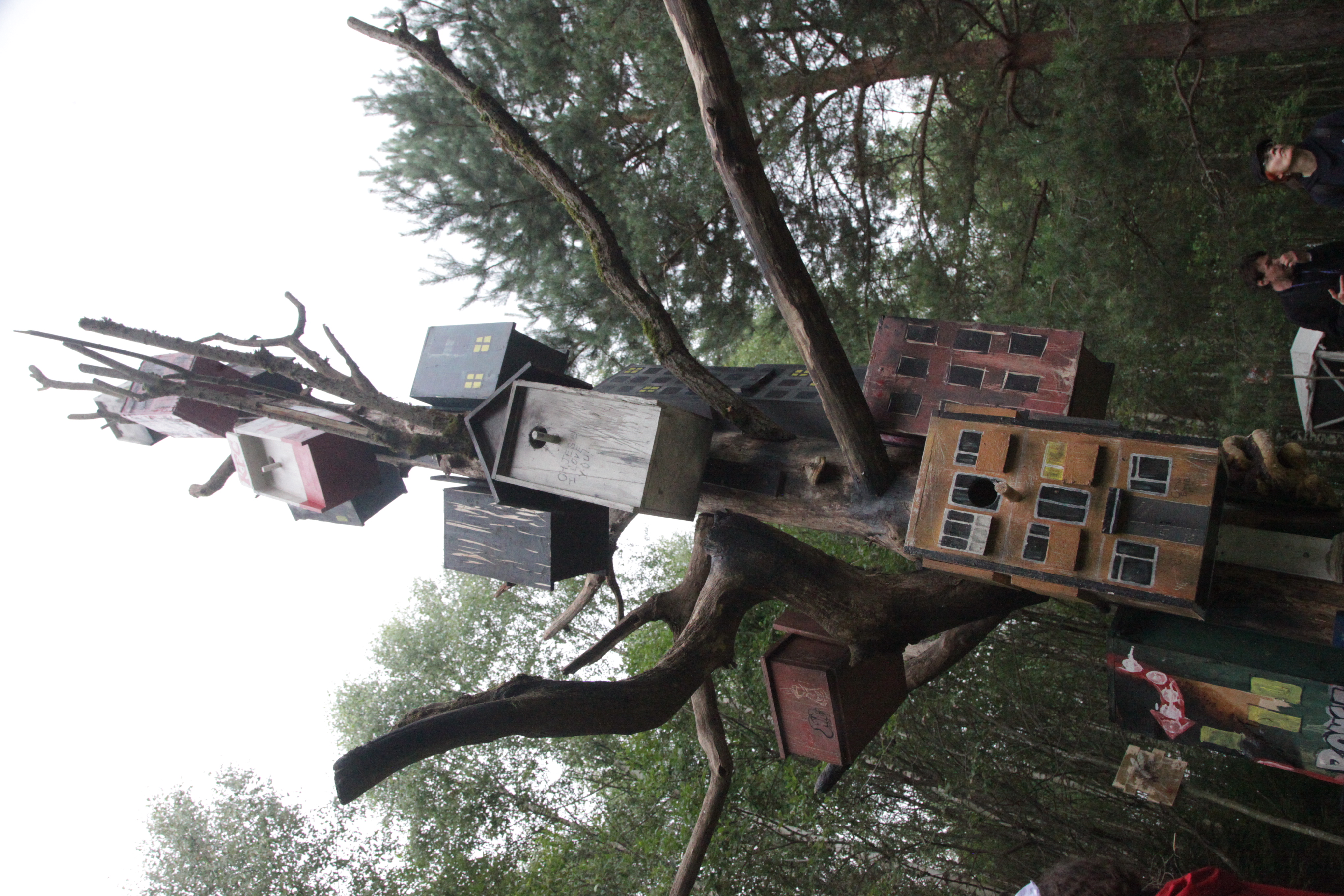 В отличие от «Алычи», нижегородская команда стрит-арта BOMS в своем художественном прогнозе оттолкнулась от эпитета «скворечник», который закрепился за современным многоэтажно-малогабаритным жильем, и представила композицию «Гетто-квартал». Возможно, идея и заключала в себе элемент социальной критики, но, похоже, присущее ребятам эстетическое чувство (в своем городе они знамениты разрисовыванием стен) помимо их собственной воли родило весьма симпатичное произведение. Правда, пока в их многоуровневой композиции могут поселиться лишь малые птахи. Но если в будущем люди научатся строить столь же живописные небоскребы, куда можно будет залетать на каком-нибудь аэромобиле или воздушном велосипеде, то я бы счел такую перспективу заманчивой.