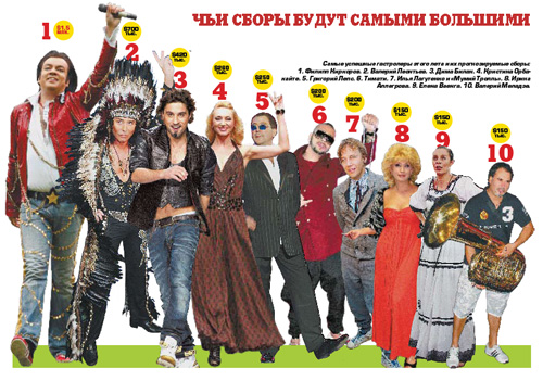 Ирина Аллегрова (ставка — 10–15 тысяч долларов) — из ветеранов попсовой сцены. Ее тур из 12 концертов больше напоминает атакующий рейд, чем курортную прогулку. Но ей далеко до группы «Мумий Тролль» (ставка около 10 тысяч долларов). У тех заявлено почти 30 концертов — правда, ни одного на российской территории, все — в Северной Америке, где уже два года у группы хорошо идут дела в клубных залах. Это редкий для отечественных звезд случай прорыва на сцены дальнего зарубежья.