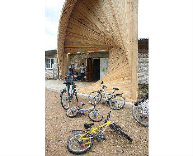 А клубу «формальному» молодые москвичи Валерий Лизунов и Екатерина Агеева из архитектурного бюро «Архпойнт» придали более актуальный вид авангардным входом из сложной дощатой конструкции-ракушки, которая так и просится, чтобы здесь проходили пленерные концерты.