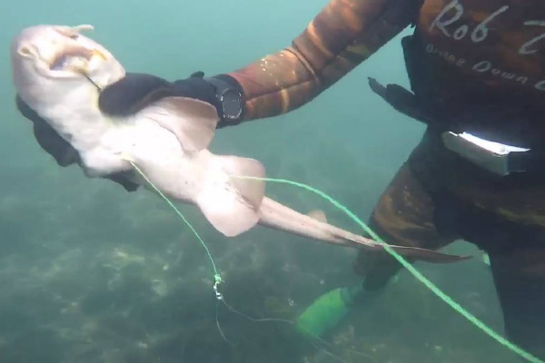 Австралийские ныряльщики сняли на видео спасение маленькой слепой акулы, проглотившей рыболовный крючок.