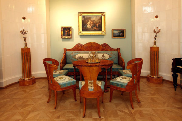 Голубая гостиная с восстановленными угловыми ечами. Здесь собирались, музицировали, читали стихи гости Василия Львовича Пушкина. Фото предоставлено пресс-службой Гос.музея А.С.Пушкина