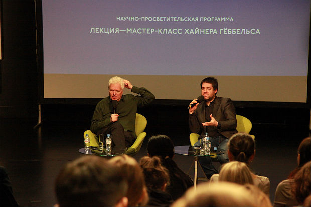 Впечатление колоритное – начиная от самого перемещения из респектабельного центра города в индустриальный, раскисший под ноябрьским дождем Красногвардейский район, где нет даже нормального тротуара, ведущего в Музей стрит-арта на территории действующего завода слоистых пластиков: именно он предоставил площадку для творческой акции знаменитого немца и его команды. Но, как оказалось, вовсе не сюда надо было ехать ради обещанной в тот же день встречи-беседы с Гёббельсом, а на Новую сцену Александринки. Стало быть – марш-бросок обратно в центр (за рулем такси – инженер аэрокосмической промышленности, так эти люди сейчас вынуждены кормить свои семьи: тоже штрих к портрету апокалиптической эпохи, о которой речь впереди). Обаяние Хайнера, в том числе в ответе на мой вопрос об источниках вдохновения – что это, музыка («Когда гора сменила свой наряд»), техника («Вещь Штифтера»), психология («Макс Блэк, или 62 способа подпереть голову рукой» – перечисляю те работы Гёббельса, которые видел раньше)?
