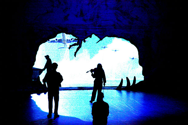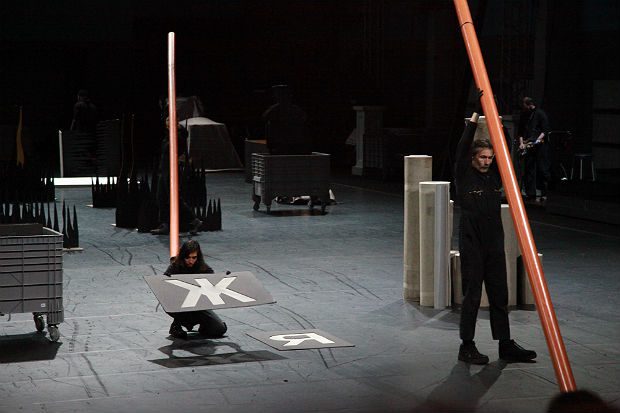 Музыка (ударные, саксофон, электрогитара, синтезатор – старинные французские «волны Мартено», почему именно они – скоро поймем) комментирует этот рассказ, то истаивая в почти неуловимых фонах, то исходя диссонансной агрессией, то искушая муляжной улыбкой холодного минимализма. В какой-то момент несколько музыкантов, ведомых скрипачкой, заходят практически в пасть сатаны, изображаемого исполинской драпировкой (сценография Клауса Грюнберга), и встают со своей медитацией на пути летящих из чрева чудовища тяжелых бомбардировщиков. Снова хроника, Сирия, американские флаги, российские флаги, шумовая кульминация.