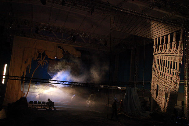 Музыка – в основном фоновая, актерской игры вовсе нет, визуальная эффектность некоторых фрагментов (особенно когда в лазерном световом туннеле замельтешили танцовщики с гигантскими, похожими на змей гибкими жгутами), повторю, во многом обесценилась неясностью общей логики. Затянувшаяся возня с ветхими тряпками, пусть и громадными, сама по себе тоже вряд ли тянет на чудо. А без чуда театр рискует превратиться в назидательную агитку.