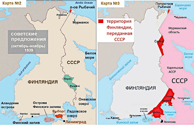 Но взамен финны предложили отдать территорию вокруг курортного Териоки, ныне Зеленогорска (желтое пятно на карте внизу). Новым стало требование передать в аренду полуостров Ханко для устройства военно-морской базы с 4-тысячным гарнизоном (в 100 км от Хельсинки!). Ну и снова передача СССР острова Гогланд и еще трех (они обведены розовой линией). Взамен предложены вдвое большие территории в Восточной Карелии (на карте № 2 отмечены зеленым).