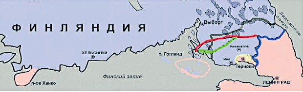 Однако через неделю финскую делегацию снова пригласили в Москву на переговоры. И объявили такие требования, которые явно заводили переговоры в тупик. Во-первых, перенос границы (она на карте внизу обозначена синим) на 90 км от Ленинграда — кстати, наконец-то появился этот пункт! Новая граница, предложенная Сталиным, отмечена красным, а зеленым — та, что он нарисовал позже, чуть смягчив требования. Как видим, обе они пересекают черную полосу: это главное укрепление финнов — «линия Маннергейма». Если подвинуть к ней границу, укрепление теряет смысл.