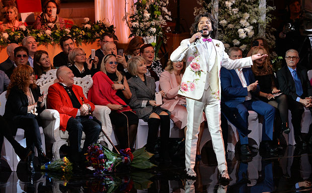 На сцене – любимые модели дизайнера и выдающиеся артисты со своими сольными номерами и словами благодарности виновнику торжества. Со сцены «зажигал» Филипп Киркоров, который в далеком 1991 году участвовал в показах Вячеслав Михайловича, и принес свой первый сценический костюм, сделанный руками маэстро. Сам Филипп в сногсшибательном плаще продефилировал в сопровождении манекенщиков несколько раз по сцене и вместе с залом спел свой хит «Ты, ты, ты!»