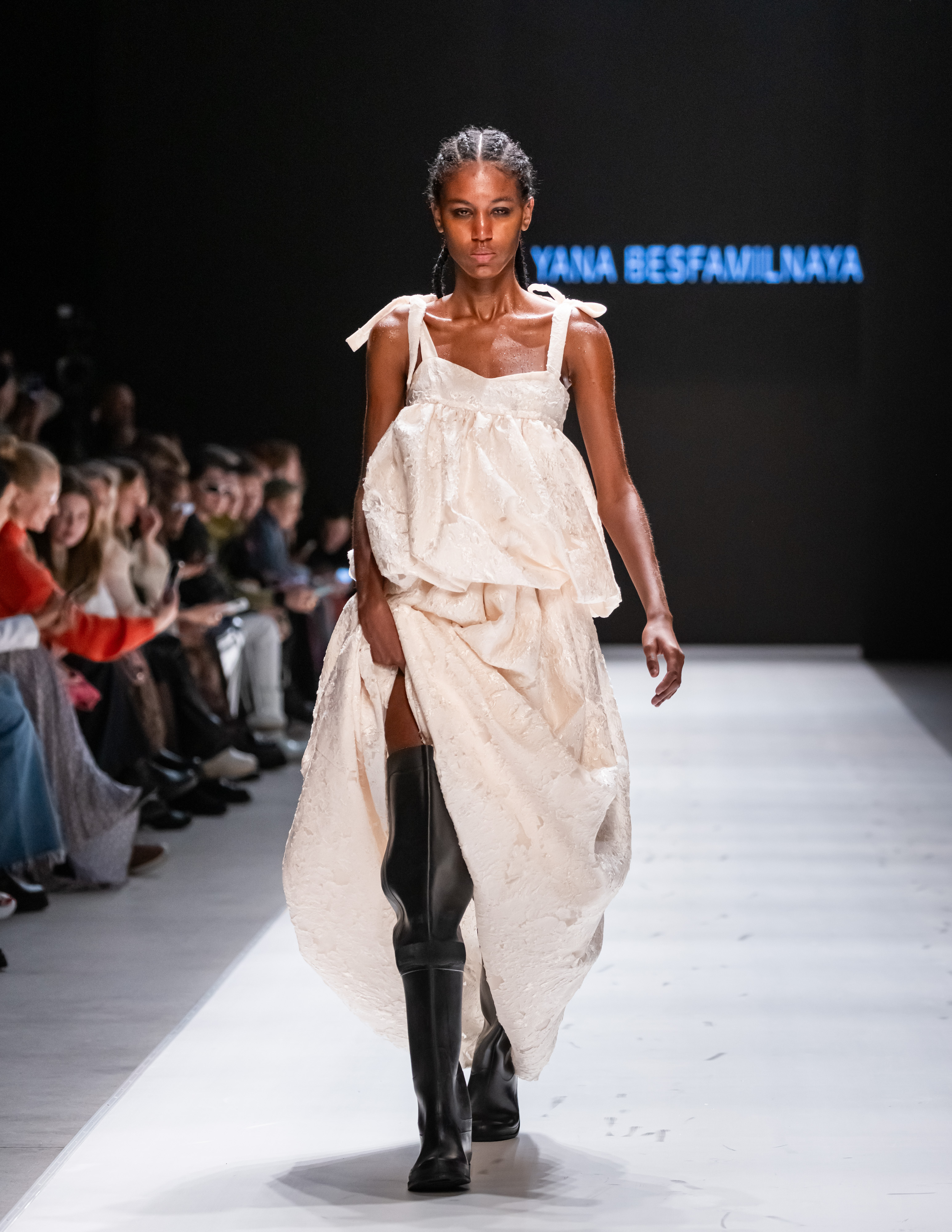 Дизайнер Яна Бесфамильная из Перми представила новую коллекцию, отражающую изменчивость современного мира. Чтобы через одежду передать ритм мегаполиса, дизайнер использовала эклектику и эффект многослойности. В коллекцию вошли полупрозрачные комплекты, ассиметричные топы, серия юбок с металлизированным эффектом, а также разнообразные юбки в длине мини, трикотажные платья, кожаные жилет и анорак. Дополнили образы веревки-репшнур, булавки, сапоги-гармошки и высокие ботфорты.