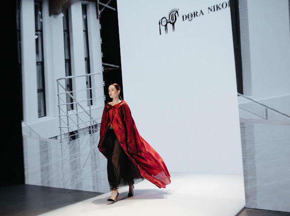 Марка Dora Nikolaeva из Якутска сочетала глубокие черные оттенки и нежные бежевые цвета, которые сменялись кроваво-алым, эффектами деграде и принтами тай-дай, напоминающими первобытные тотемные рисунки. Дефицит цвета в коллекции с лихвой компенсировался фактурами — буклированная шерсть, гладкая кожа, сетка, полупрозрачные ткани соединялись и наслаивались друг на друга, создавая сложные образы.