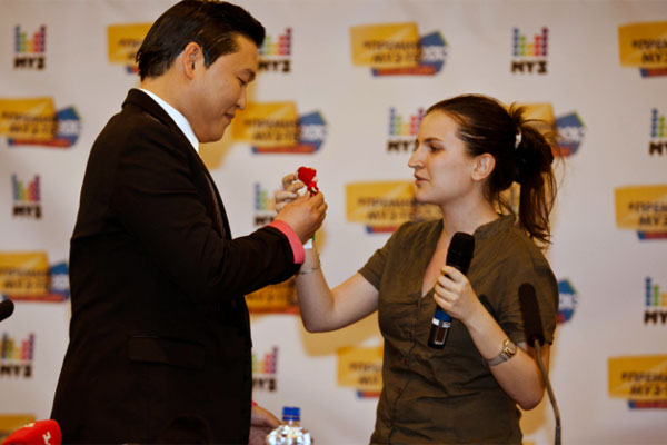 На встречу с журналистами, которую устроили накануне церемонии в «Олимпийском», PSY пришел сразу же, как только прилетел из Лос-Анджелеса с пересадкой во Франкфурте. Летел он примерно 15 часов и ужасно устал. Да не просто устал — на вид вообще был еле живой. Тем не менее одет он был, как в клипе, и пиджак, и прическа — все было на месте. Свой знаменитый танец исполнять не стал — и то спасибо, что ворочал языком и кое-как отвечал на вопросы.