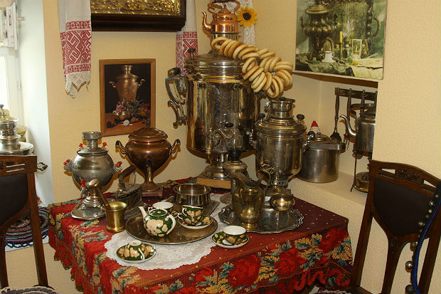 В соседнем зале висят тысячи всевозможных колокольчиков — настольных, дверных, поддужных, подпружных, церковных, рыбацких... Рядом уникальная коллекция утюгов, среди которых есть даже деревянные — с них когда-то и начиналась эра глажки и утюжки на Руси. А в соседних помещениях — уникальная коллекция самоваров и образцов каслинского литья, фарфоровых статуэток и золотофонных икон конца XIX — начала XX века.