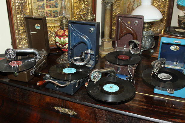Сама коллекция ошарашивает. Счет уникальных предметов идет на сотни и тысячи. В одном зале, с которого мы и начали экскурсию, собраны всевозможные часы и музыкальные инструменты, а также виниловые пластинки с голосами Карузо, Шаляпина, Собинова, Утесова, Вертинского, Шульженко, Изабеллы Юрьевой, Вадима Козина, с историческими речами Ленина, Сталина, Молотова, Вышинского — всего порядка 15 тысяч экземпляров.