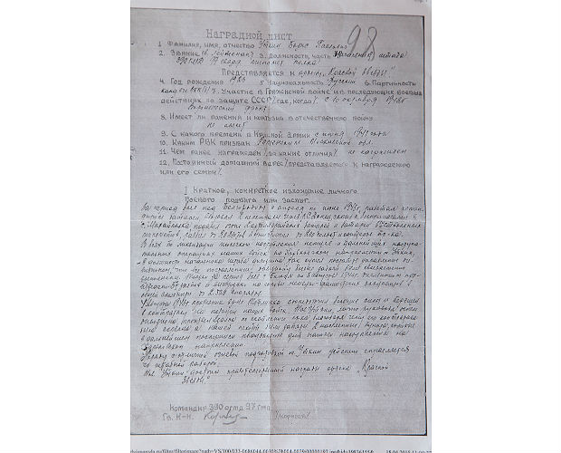 Наградной лист на присвоение лейтенанту Борису Уткину ордена Красной Звезды за бои в районе Белгорода. Лето 1943 года. Документ из личного архива