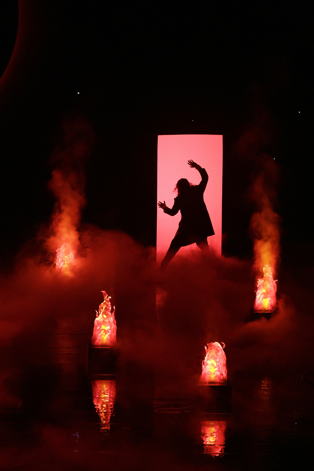 Но в целом во втором действии все сильнее ощущается пробуксовка «комической концепции». Спасая которую, постановщикам приходится то выдумывать странные ходы вроде превращения арии Эльвиры в сеанс написания портрета Дон Жуана (как говорится, ничто не предвещало – на художественные устремления этой дамы в опере нет ни малейшего намека), то, когда таких ходов не находилось, просто ударяться в банальность: кладбище – ну вот вам частокол памятников-истуканов; ад – получите столбы огня и клубы дыма.