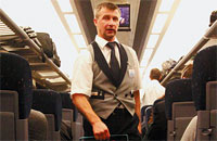 «Никто не сказал: я не поеду, я боюсь! — гордо подтверждает начальник поезда Иванов. — Все пришли на работу по форме, отглаженные, с хорошим настроением (я не быстро говорю?), чтобы приступить к работе по обслуживанию пассажиров в фирменном поезде «Невский экспресс» — в кавычках», — диктует он.