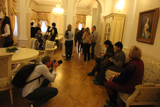 Экскурсию напутствовал первый заместитель председателя правления Росэнергобанка Марк Шрайбер, а провел краевед Денис Ромодин. Рассказ начался с парадного зала, где сохранилась лепнина, а на каминной полке стоит фотография свадьбы Николая и Лидии Прохоровых, прошедшей в этом помещении в 1902 году, и можно видеть тогдашних жильцов усадьбы, богатое убранство, в частности штофную обивку стен, от которой сегодня ничего не осталось.