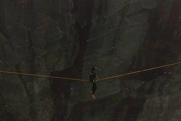 Находясь на высоте около 900 метров, канатоходец потерял равновесие и сорвался с троса. К счастью, мужчина остался жив: от падения в пропасть его спас страховочный трос.