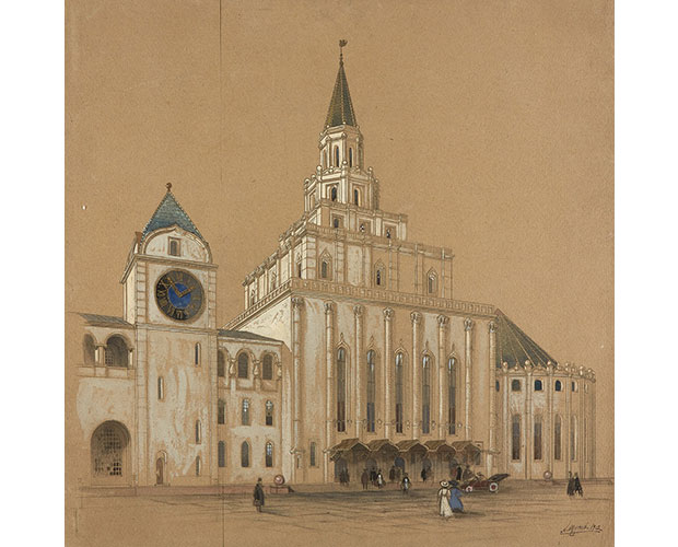 Завершающая часть выставочного «триптиха» — Казанский вокзал. Памятник двух эпох, самая точная метафора творческого пути Алексея Щусев, талант которого нашел себе достойное применение и при новой власти. Один из самых амбициозных архитектурных проектов Российской империи, он был осуществлен тем, кто его задумал, уже в другой стране, что неизбежно потребовало изменений замысла. Подлинной жемчужиной экспозиции стали несколько рисунков, сделанных к этому проекту — вид главного фасада со стороны Каланчевской (ныне Комсомольской) площади, эскизы зодиакальных часов для Часовой башни и перекрытий перронов.
