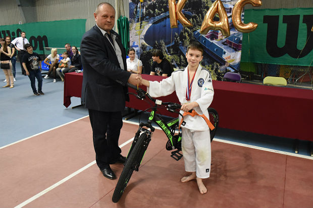 Генеральный директор и главный тренер клуба дзюдо «Каскад» Юрий Крищук вручает приз победителю прошлогоднего фестиваля