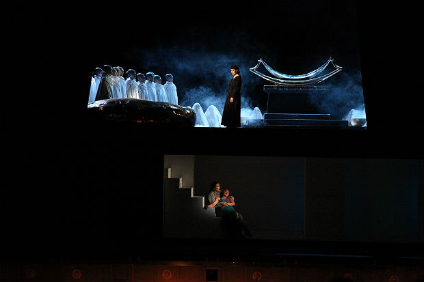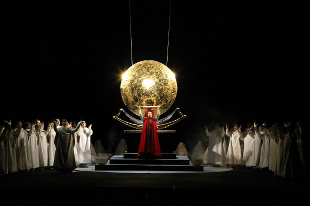 Оказывается, ничем особенным — просто дать музыке прозвучать в полную силу. Именно такова, как признался Петер ШТАЙН, была его главная установка. Мы не увидели ни обязательных для «императорских» театров пышных декораций, якобы воскрешающих Древний Египет, ни ироничной пародии в виде какого-нибудь парада ракетных войск вместо шествия фараонова войска. Сценограф Фердинанд Вегербауэр порой ограничивался одной стилизованной аркой храма на весь громадный объем сцены — но это помогало сконцентрировать внимание на музыке. Сам Штайн не тужился в изобретении невиданных мизансцен — но вышло строго (особенно в «конструктивистской» сцене суда) и красиво (особенно в эпизоде воинского посвящения Радамеса).