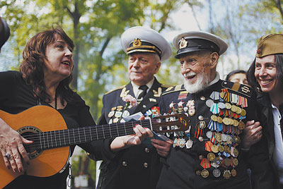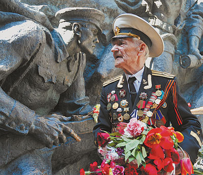 Украинский ветеран возлагает цветы к мемориалу погибшим в Великой Отечественной войне.