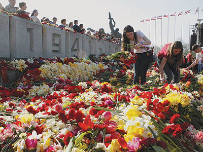 Возложение цветов к памятнику советским воинам в Риге (Латвия).