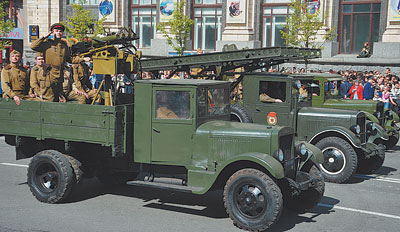 В Киеве по Крещатику прошла военная техника времен Великой Отечественной войны, в том числе легендарные установки «Катюша». В автомобилях сидели участники местного военно-исторического клуба. Они одеты в советскую форму времен войны.