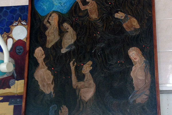 - Это - знак Божией матери, например. И таких знаков множество, в основном на храме их вижу. Пытался найти книгу, где они все со значением будут, но не нашел. Уже три года так, с тех пор как первая жена от рака умерла. А до этого в основе были сновидения. Ну вот, допустим. Одна из моих лучших работ, три года рисовал, - показывает фотографию. - Картина называется «Грязь». Здесь я изобразил алкоголиков, проституток, наркоманов, пытающихся выбраться из этой ямы наружу. К сожалению, получится далеко не у всех.