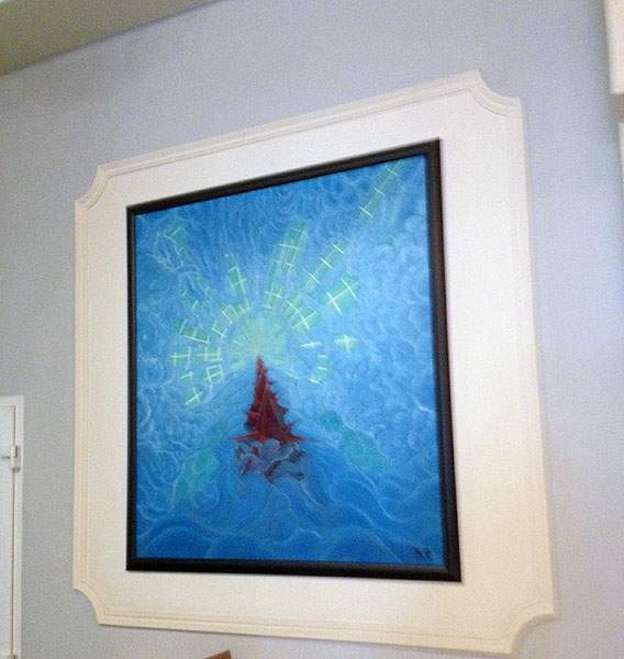 - Сейчас времени почти нет. На мне жена и сын. На работе устаю. Жена звонит, говорит, быстрей домой, ну, я бегом к ней. Не высыпаюсь. Но рисую все равно регулярно, дня три в неделю выкраиваю. Насчет времени – по-разному всегда. Вот те картины, которые ты в коридоре видел, их за полгода каждую нарисовал где-то. А над этой уже три года работаю. Тут в будущем ангелы будут, облачка. Постоянно задумываешь одно, а получается совершенно другое.