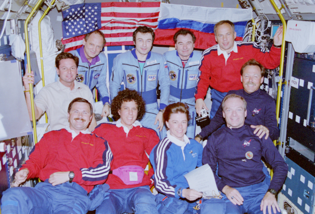 Поводом для новой встречи со Стрекаловым в 1995 году стал только что завершившийся первый полет по программе «Мир» — «Шаттл», в рамках которой шаттлы доставляли на орбиту российских космонавтов, а американские астронавты работали на станции «Мир». 27 июня Стрекалов вместе с Владимиром Дежуровым и Норманом Тагардом (на общем снимке внизу, сделанном на станции «Мир», они в верхнем ряду справа налево, в голубых костюмах) встречали «Атлантис». Стыковка прошла успешно, событие окрестили историческим, хотя кто сейчас вспомнит ту историю? Вот они, ее участники. В первом ряду: Николай Бударин, Эллен Бейкер, Бонни Данбар и Чарльз Прекорт, чуть выше справа: Роберт Гибсон и Анатолий Соловьев, а слева, в белом — Грегори Харбо.