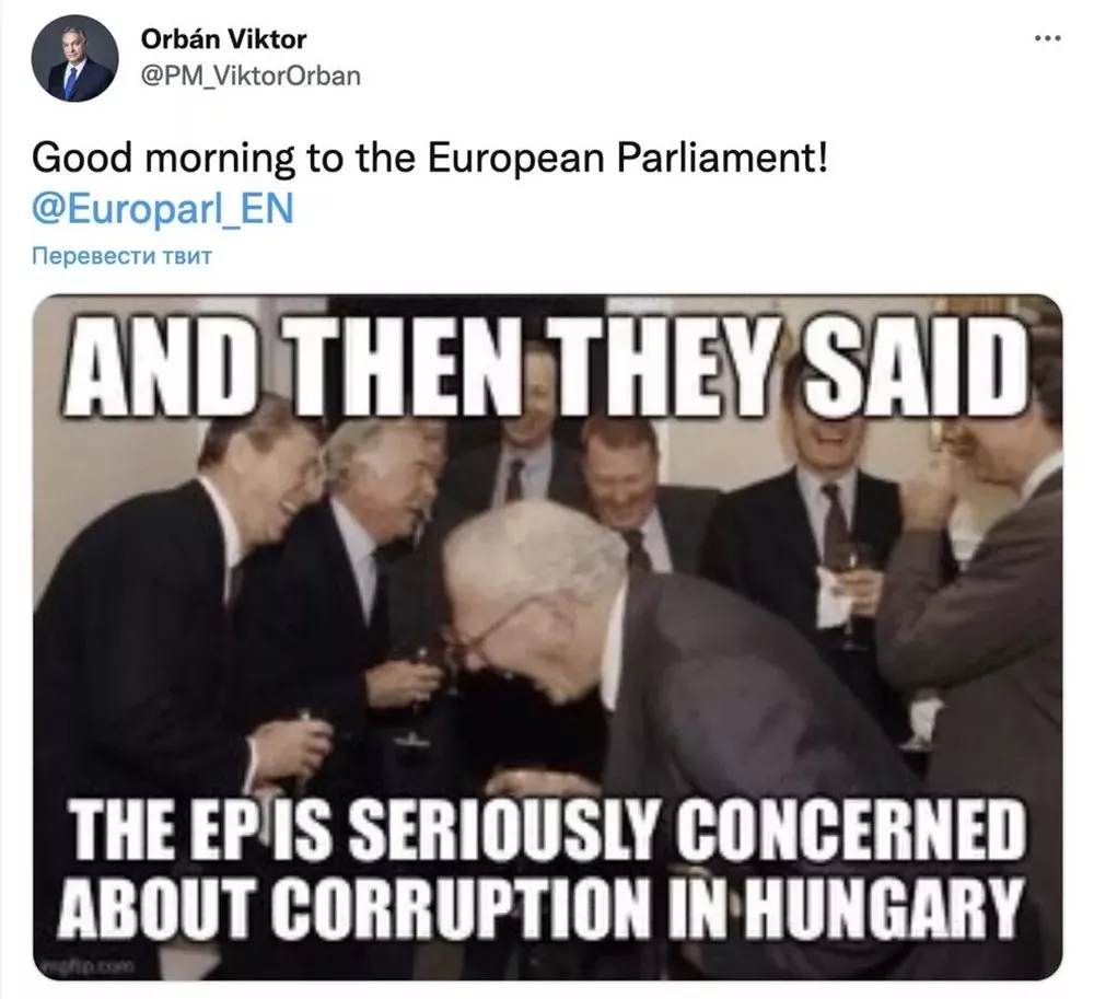 В своем Twitter-аккаунте политик написал: «С добрым утром, Европарламент!». К посту Орбан прикрепил мемный рисунок с хохочущими политиками и надписью: «И тут они говорят: «Европарламент всерьез обеспокоен по поводу коррупции в Венгрии».