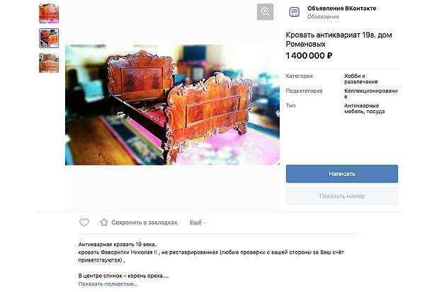 Жительница Москвы опубликовала объявление о продаже кровати, продает в «Объявлениях Вконтакте» антикварную кровать XIX века, которая, как утверждает продавщица, принадлежала фаворитке последнего российского императора Николая II.