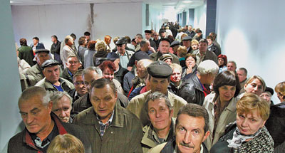 Для нее и других женщин предпенсионного возраста очереди только начинаются. Чтобы начать получать досрочную пенсию, им придется в течение двух недель встать на учет на биржу труда («Если все туда ринутся, мы город снесем!» — говорят увольняемые), простоять там на учете три месяца, отмечаясь раз в месяц, и только потом можно будет направить ходатайство о досрочной пенсии. Пока она рассказывает, вокруг собирается толпа, одобрительными возгласами подбадривающая возмущенную женщину.