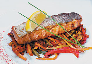 Филе рыбы нарезать порционными кусками. Сельдерей нарезать полосками длиной 10 см. Перец очистить от семян, разрезать вдоль на 10–12 частей. Рыбу поперчить, посолить, выложить на противень, сверху разложить овощи в форме решетки. Запекать в СВЧ 5 минут при уровне мощности 80%. На гарнир подать отварной рис, ломтики лимона.