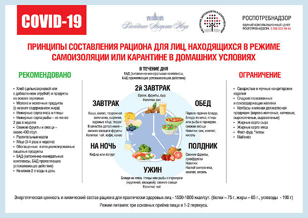 Федеральный исследовательский центр питания, биотехнологии и безопасности пищи разработал принципы рациона для лиц, находящихся в режиме самоизоляции или карантина в домашних условиях. Об этом сообщает пресс-служба Роспотребнадзора.