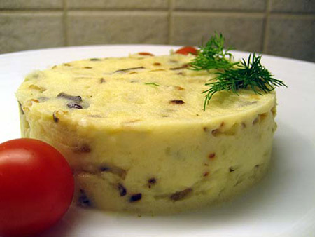 Очищенный картофель сварить до готовности в подсоленной воде. Отвар слить, а картофель в горячем виде протереть, добавить обжаренный до золотистого цвета репчатый лук, молотый перец и развести подготовленный картофель до консистенции густой сметаны. Массу положить в тарелку (слоем 4—5 см). Поверхность разровнять, столовой ложкой нанести волнообразный рисунок и поставить в холодильник с плюсовой температурой на 2—3 часа. Посыпать картофельный холодец мелко нарезанной зеленью петрушки или укропа. Отдельно подать чесночную заправку.