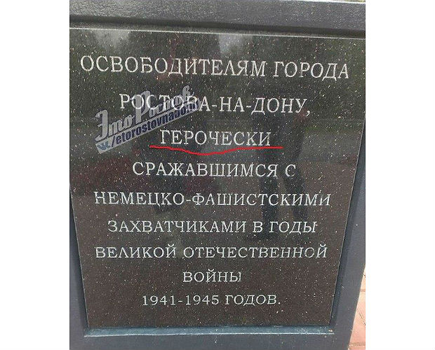 В Ростове-на-Дону появился памятник советским воинам, освободившим город от войск нацистской Германии в годы Великой Отечественной войны. Памятная надпись на граните оказалась выгравирована с ошибкой, сообщает портал «Блокнот Ростов-на-Дону».