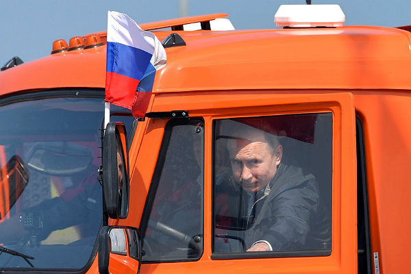 На грузовике «КамАЗ» Владимир Путин проехал по мосту через Керченский пролив, который соединил Крым и Тамань. Президент возглавил колонну строительной техники. Дорога по мосту заняла у него 16 минут.