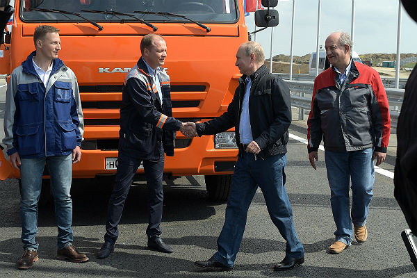 Церемония награждения состоялась на самом мосту на фоне грузовика КамАЗ, на котором президент Владимир Путин проехал по мосту во главе колонны строительной техники.