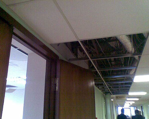 Повсюду намокли ковры, от потолка отпадают плитки. Особенно сильно пострадало помещение, где работают представители информагентств. Вода залила компьютеры, часть техники пришла в негодность. Обвалились облицовочные потолочные панели, отклеились обои, поднялся паркет. Между тем, в комнате недавно делали ремонт. Кроме этого, повреждена мебель, пострадали и личные вещи корреспондентов.