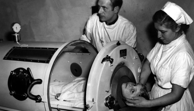 На снимке в начале статьи — «дедушка» нынешних аппаратов ИВЛ, первые «железные легкие», которые применили в 1920-е годы в Бостоне. В Америке тогда одна за другой шли волны эпидемии полиомиелита. Летом 1921-го ее жертвой стал и будущий президент Франклин Рузвельт. Вирус, поражая нервную систему, вызывал паралич мышц: чаще всего — спины и ног, но иногда и дыхательных. Единственным спасением в таком случае была специальная барокамера, где воздух при понижении давления сам устремлялся в легкие, а при повышении — выходил наружу.