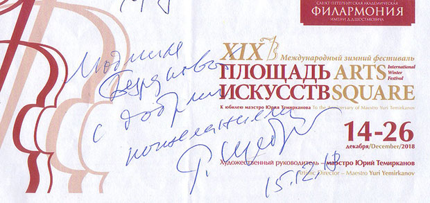 Заполнялся партер в тот вечер в основном статусными зрителями. Сижу, гляжу – сплошь знаменитости! В какой-то момент рядом со мной остановился высокий пожилой мужчина в элегантном костюме: «Не помешаю?». Голос негромкий, взгляд приветливый, но грустный. Щедрин! Сел на краешек «моей» кушетки, при том что места вполне хватало на двоих. Сразу «кидаться» к нему с разговорами не решилась, хотя и очень хотелось: когда ещё выпадет возможность неформально пообщаться с одним из крупнейших композиторов современности? Выждала несколько минут, прежде чем протянула ему программку и ручку: «Можно автограф, Родион Константинович?». Он расписался на программке, извинившись, что «немного криво, забыл в гостинице очки». Остановился, к слову, не в забронированном ему организаторами фестиваля отеле, а в другом, где любил, как признался, бывать с Майей Михайловной, но оттуда до Большого филармонического зала добираться подольше. Потому и на концерт пришел раньше, боясь опоздать.