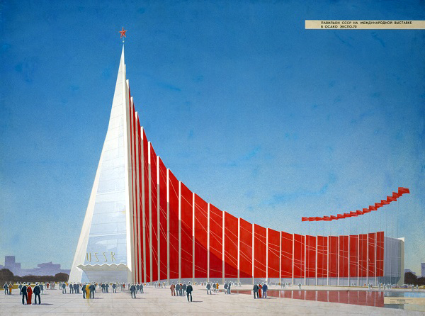 Павильон Экспо1967 в Монреале его создатели посвятили 50-летию СССР. В макете Красноярской ГЭС текла вода, в бассейне плескалась рыба, а в отделе «Уголь» под землю спускалась шахтерская клеть… Когда в моду вошел функционализм, в Осаке1970 советский павильон силуэтом и алым цветом напоминал гигантский развернутый флаг, трепещущий на ветру.