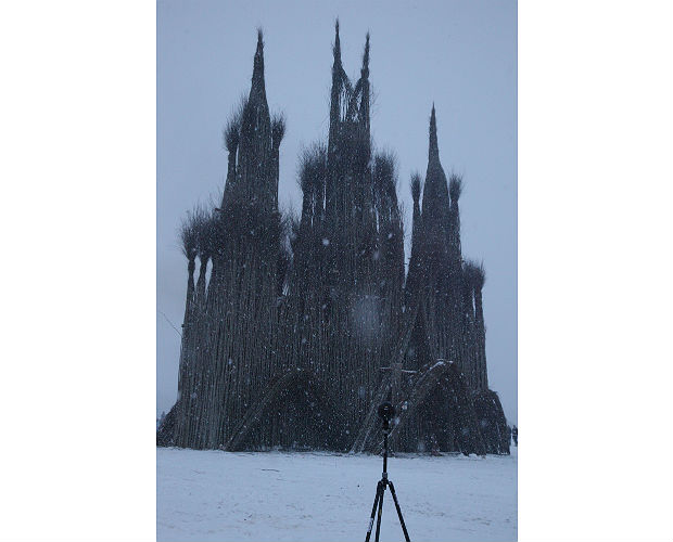За полтора месяца на масленичной поляне близ Никола-Ленивца выросло причудливое сооружение, словно собранное из сотен метелок. Немаленькое: 25 метров в высоту. Основной материал – ольховые ветки и другой деревянный хлам. Строили, рассказывает художник, силами 12 человек из той самой никола-ленивецкой артели, в том числе в самые крепкие морозы, когда автокраны отказывали, но люди – ни разу.