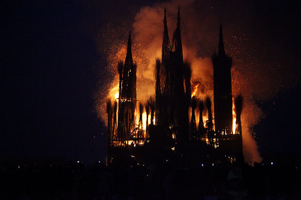 В минувшие выходные по всей России провожали Масленицу и жгли ее чучела. Провели огненный спектакль и в калужской деревне Никола-Ленивец, где уже много лет устраивает такие представления известный лендарт-художник Николай Полисский. В новой его акции старинный архитектурный термин «пламенеющая готика» неожиданно приобрел буквальный смысл. Но еще более неожиданным оказался полыхнувший затем скандал, начало которому положил, как ни странно, юморист Максим Галкин.
